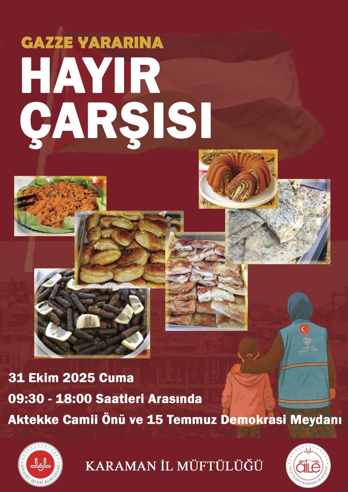 Müftülük tarafından düzenlenen “Gazze Yararına Hayır Çarşısı”, 31 Ekim Cuma günü Karaman’da vatandaşlarla buluşacak.